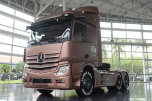 No estande foi exposto uma versão do Actros Evolution “Estrela Delas” 2553 6×2, com motor OM 471 LA de 530 cv, o mais potente da marca no Brasil, câmbio automatizado PowerShift Advanced G291 de 12 marchas, tomada de força, suspensão metálica, rampa de quinta roda, geladeira, MirrorCam, painéis digitais e a cor rosa magnólia, ícone visual do Actros. “Estrela Delas”.
