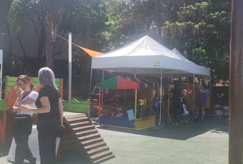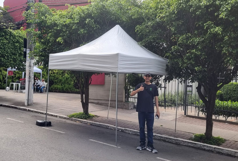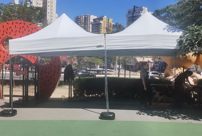 As tendas 3×3 são muito populares junto ao público. Elas são muito fácil de montar, desmontar, transportar e guardar. Seus pés podem ser chumbados no chão ou presas com cordas e pesos reforçados, trazendo mais segurança e estabilidade aos frequentadores.