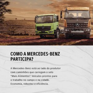 “Nosso portfólio oferece caminhões para todas as atividades do agro e isso naturalmente inclui a agricultura familiar, que tem um papel essencial na produção de alimentos para os brasileiros”, afirma Jefferson Ferrarez, vice-presidente de Vendas, Marketing e Peças & Serviços Caminhões da Mercedes-Benz do Brasil. “Nesse sentido, com vários modelos Accelo e Atego, entregamos aos pequenos agricultores caminhões amplamente reconhecidos no mercado pela qualidade, força, robustez e resistência para as operações fora de estrada, na estrada e nas cidades, como as dos produtores do campo, que levam seus produtos até as centrais de abastecimento e aos diversos pontos de venda”.