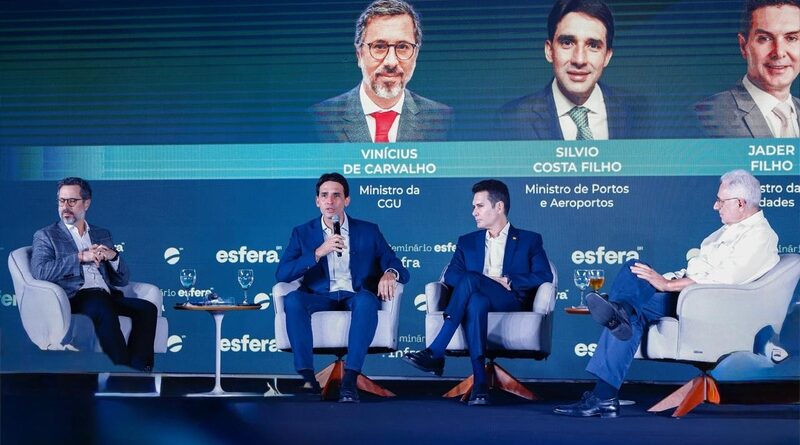 O seminário Esfera Infra promovido pelo Instituto Esfera Brasil reuniu no Recife (PE) ministros, parlamentares e gestores públicos para colocar em discussão estratégias que podem ser adotadas pelo poder público com vistas ao crescimento brasileiro dentro do atual cenário econômico mundial. O ministro de Portos e Aeroportos, Silvio Costa Filho, participou do painel “O Brasil em Construção” ao lado do ministro das Cidades, Jader Filho, e do ministro da Controladoria Geral da União, Vinícius de Carvalho. A mediação ficou por conta do jornalista William Waack.