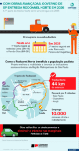 Com as obras retomadas 6 meses antes do previsto, o Rodoanel Norte terá o 1º trecho entregue em 2025, segundo o Governo de São Paulo. Serão 22 quilômetros, ligando a Dutra (BR-116) à Fernão Dias (BR-381). Um dos objetivos é aliviar o trânsito na Região Metropolitana, especialmente na capital e nos municípios de Guarulhos e Arujá. Se consideradas as duas fases do projeto, são 44 novos quilômetros de extensão e um investimento de R$ 3,4 bilhões. O valor total é dividido entre o Estado e a concessionária responsável pela via. O outro trecho do anel viário–da Fernão Dias à Avenida Raimundo Pereira de Magalhães– está previsto para o 2º semestre de 2026. Ao todo, cerca de 10.000 pessoas trabalham nas obras, direta ou indiretamente.
