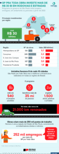 A fim de ampliar tais benefícios às demais regiões do Estado, o governo paulista criou o “São Paulo pra Toda Obra”. O programa inclui mais de 1.500 obras em estradas vicinais e rodovias públicas ou concedidas. Até agora, 636 foram concluídas e 241 estão em andamento. O restante está prestes a começar ou em fase licitatória. Ao todo, o investimento é estimado em mais de R$ 30 bilhões, sendo R$ 14,9 bilhões do DER-SP (Departamento de Estradas de Rodagem de São Paulo). Dentre as melhorias estão pavimentações, recapeamentos e duplicações. No final, serão 21.000 km renovados –extensão superior à distância de São Paulo a Tóquio, no Japão. Conforme o plano anunciado, o “São Paulo pra Toda Obra” fará melhorias em cerca de 80% das cidades paulistas e em todas as divisões administrativas do Estado. As mais relevantes, em número de obras e valor investido, são as regiões: