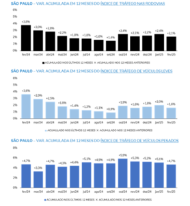 Em relação ao cenário bimestral de 2025, as rodovias paulistas registraram um aumento de 4,4% no fluxo de veículos em comparação com o mesmo período de 2024. Já nas rodovias fluminenses, o crescimento foi mais expressivo, alcançando 5,4%, com destaque para o aumento de 7,0% nas viagens realizadas por veículos pesados e de 5,1% nos veículos leves. No acumulado dos últimos 12 meses, o estado de São Paulo apresentou um crescimento de 2,1%, impulsionado por um aumento de 4,7% no tráfego de veículos pesados e de 1,6% no de veículos leves. Por outro lado, no Rio de Janeiro, o crescimento acumulado foi de 2,4%, com destaque para o robusto aumento de 8,7% no fluxo de veículos pesados, enquanto os veículos leves apresentaram um crescimento mais modesto de 1,5%.