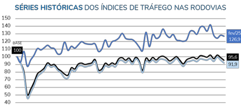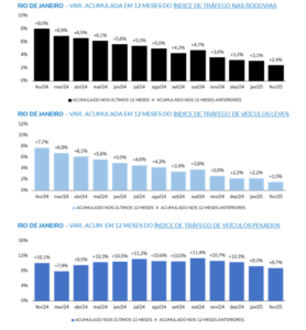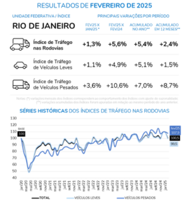 Já o estado do Rio de Janeiro registrou um crescimento de 1,3% no fluxo agregado de veículos, após a exclusão dos efeitos sazonais. O destaque foi o aumento no tráfego de veículos pesados (+3,6%), em comparação ao de veículos leves, que subiu 1,1%. Quando comparado com fevereiro de 2024, o crescimento no tráfego foi ainda mais significativo, alcançando 5,6%, impulsionado especialmente pelo desempenho dos veículos pesados (+10,6%) e também pelos veículos leves (+4,6%).