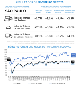 São Paulo, março de 2025 — Entre janeiro e fevereiro de 2025, o Índice de tráfego nas rodovias de São Paulo cresceu 1,7%, com destaque para o aumento de 2,1% no fluxo de veículos leves. Em comparação a fevereiro de 2024, houve uma elevação de 5,1% no tráfego, sendo impulsionada por avanços tanto no segmento de veículos leves (+5,0%) quanto no de veículos pesados (+5,6%).
